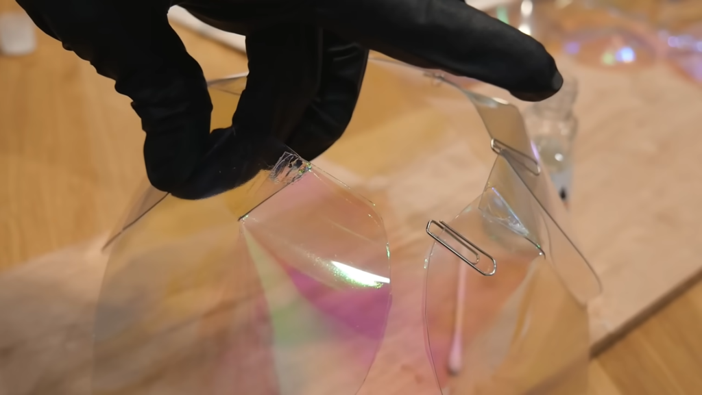 Rachel originally plans to paint the material to create color, but it doesn’t work well once light passes through it. The effect she wants doesn’t show clearly. Instead of forcing it, she switches to holographic sheets, which reflect light naturally and create a better result. This small change makes a big difference in the final look. It’s a good reminder that adjusting your approach can lead to better outcomes. Sometimes simpler solutions work better than complicated ones.